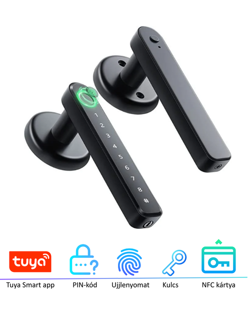 Ujjlenyomattal, kártyával, PIN-kóddal és mobilalkalmazáson keresztül (Tuya Smart) is használható, kulcs nélküli beléptetést biztosít. 4 db AAA elemmel működik, hosszú üzemidővel, szükség esetén kábelen keresztül tölthető, lemerülés esetén pedig kulccsal is nyitható.